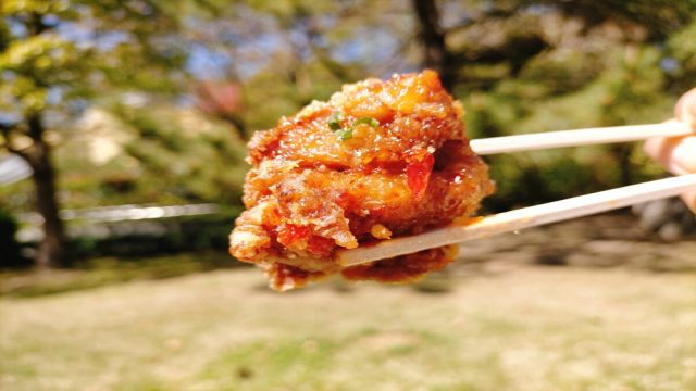 たべちゃんが食べた「もも唐揚げ」は、揚げたてを一口食べると柔らかくジューシーで、衣がサクサクでカリッとしていて、肉の旨味が溢れます。
